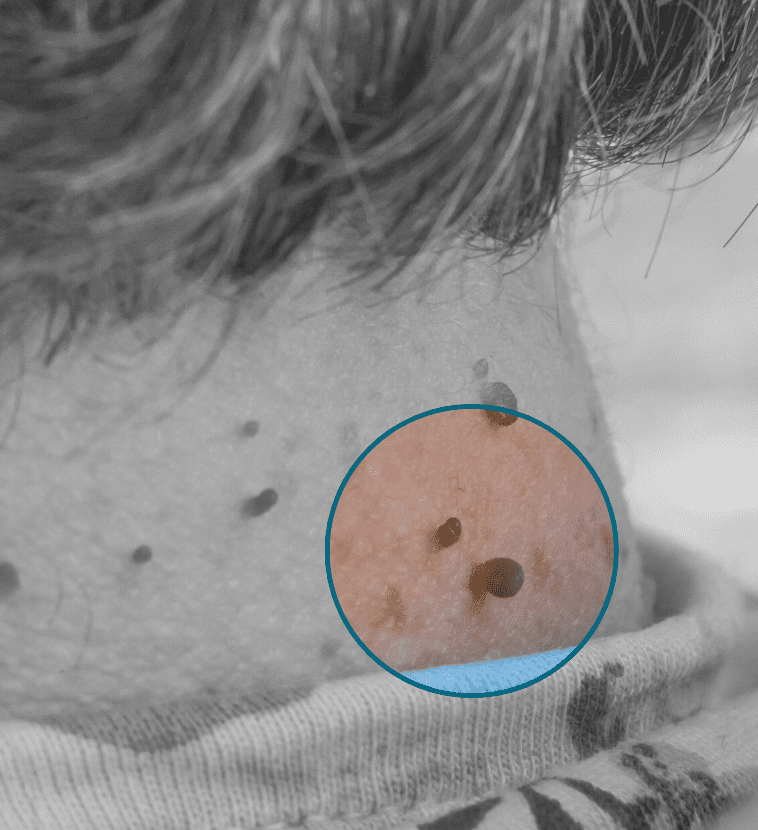 Skin tags usually occur because the skin rubs against itself in the folds of the skin. These are usually benign lesions but can be a significant nuisance, causing cosmetic disturbance and sometimes discomfort e.g. necklace area. Although skin tags can often look like warts, they are usually smooth, soft and knobbly and hang off the skin, but most importantly, are non-contagious.
